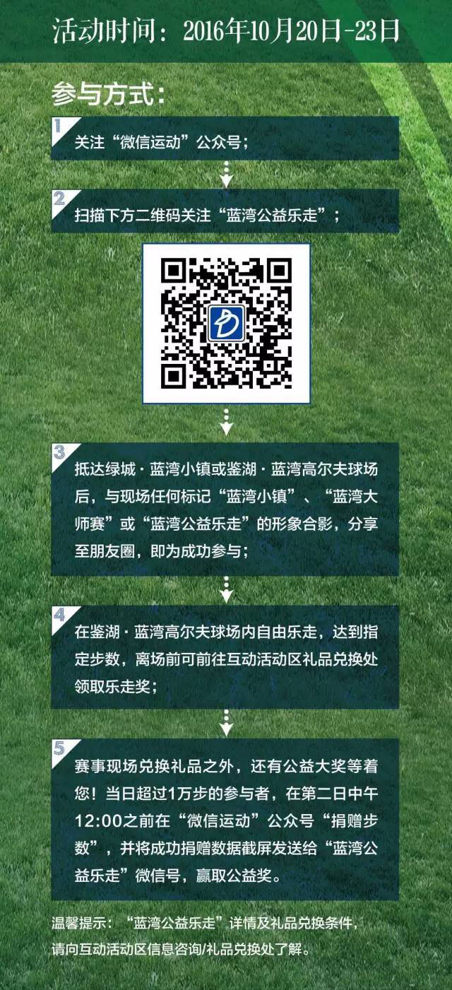 凡在10月20日-23日,关注“微信运动”公众号和“蓝湾公益乐走”微信号(长按下图中二维码即可关注),并在抵达绿城蓝湾小镇或鉴湖•蓝湾高尔夫球场后,与现场任何标记“蓝湾小镇”、“蓝湾大师赛”、或“蓝湾公益乐走”的形象合影,分享至朋友圈,即为成功参与。