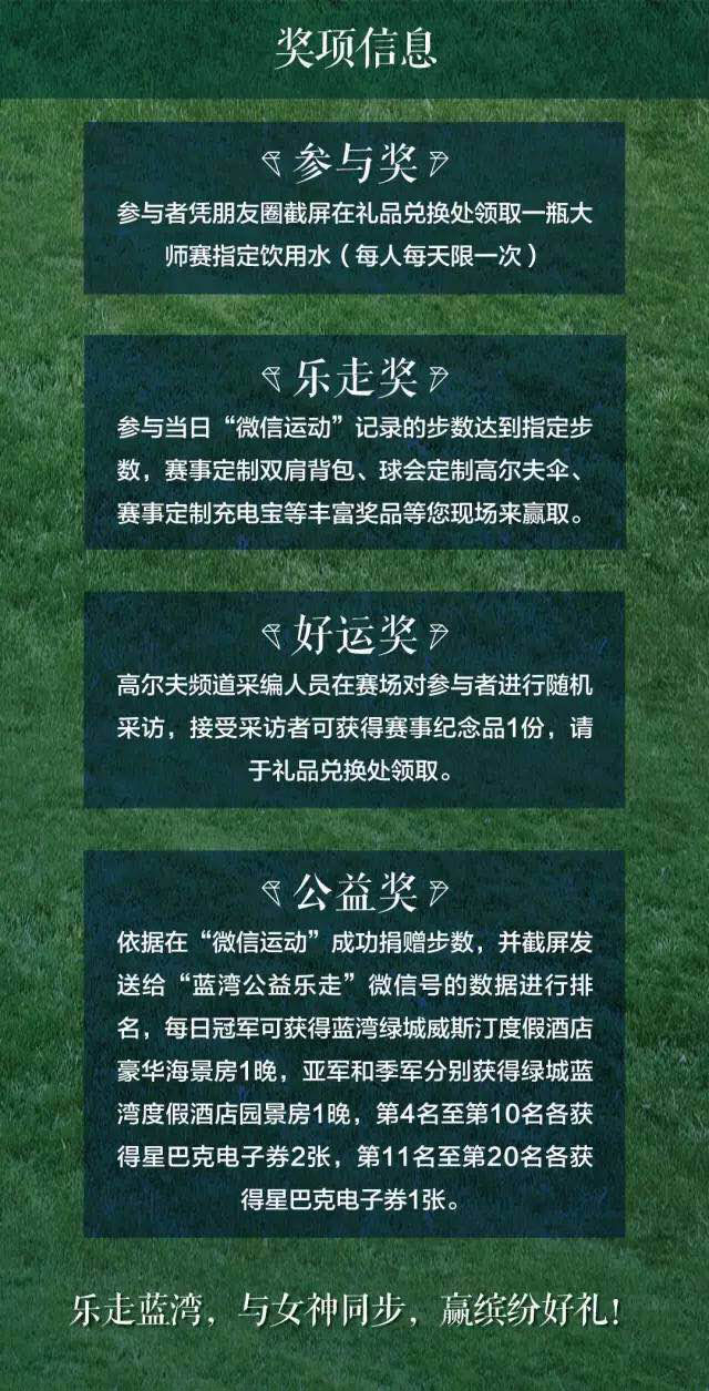 参与当日,“微信运动”记录的步数达到指定步数,即有机会获得“乐走奖”,赢取赛事定制双肩背包、球会定制高尔夫伞、赛事定制充电宝等丰富奖品。