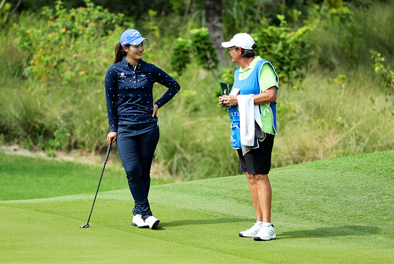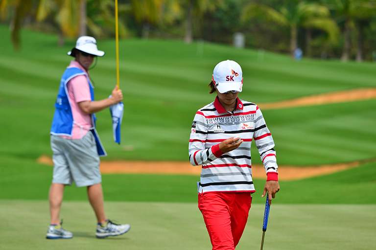 带着两杆优势出发,她今天的铁杆发挥异常出色,推杆相当精准,在四号洞推入12英尺小鸟,七、八号洞均有斩获,特别是八号洞35英尺长推抓鸟。澳大利亚姑娘最后两只小鸟出现在16号洞和17号洞,都推入15英尺推杆。