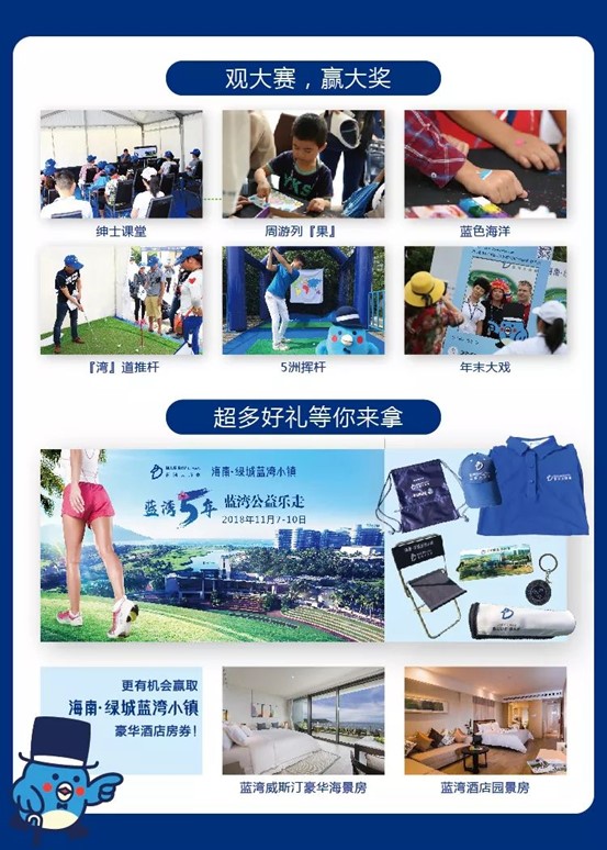 蓝湾公益乐走通过和『微信运动』捐赠步数相结合,在4轮赛事期间,你的乐走记录不仅可以在朋友圈刷步数排行榜,还能捐赠做公益。除了做公益之外,主办方提供的丰厚礼品也会让你不虚此行!想收获高球女神同款蓝湾周边产品?蓝湾威斯汀、蓝湾酒店入住体验机会?这些由亲子嘉年华和蓝湾公益乐走提供的奖品,我们全都送!送!送!